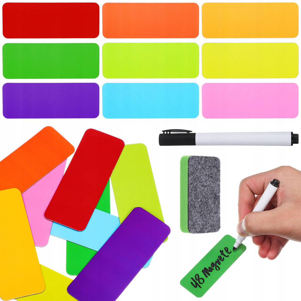 ????Ten zestaw etykiet z magnesami suchościeralnymi jest dostępny w różnych jasnych kolorach i zapewnia dużo miejsca na zapisywanie codziennych przypomnień i planów. Dzięki warstwie magnetycznej etykiety te można przymocować do lodówki, & nbsp;tablicy lub innego metalowego przedmiotu. Do zestawu dołączona jest również szczotka ułatwiająca czyszczenie.