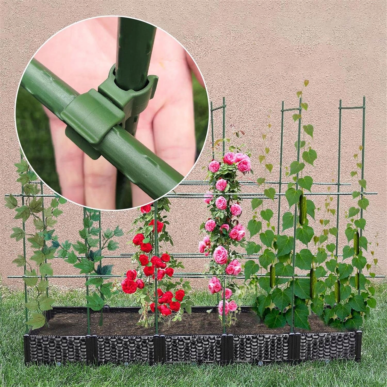 Trwały materiał Te regulowane klipsy łączące do roślin są wykonane z trwałego materiału PP i mogą być stosowane przez długi czas co może utrzymać ramę stabilnie i pomóc roślinom lepiej rosnąć. Jest to niezbędne narzędzie do Twojego ogrodu. Zakres dostawy Otrzymasz 60 sztuk uniwersalnej klamry która pasuje do słupków kaliber 11 mm co wystarczy aby łatwo zbudować stabilne ramy pnące. Regulowany Środkowa część złącza nie jest zamocowana a kierunek klipsa można dowolnie regulować tak aby pasowała do ram podpierających rośliny w różnych kierunkach. Zastosowania Te plastikowe klamry łączące nadają się do włosia pomidorów runa bakłażana stojaka z winogron i innych warzyw i owoców zapewniając praktyczną i przydatną oprawę dla roślin i warzyw. Bezproblemowa instalacja Wszechstronne złącza umożliwiają szybki montaż stabilnej ramy pnącej. Po zbiorach są łatwe do zdjęcia i zajmują niewiele miejsca.