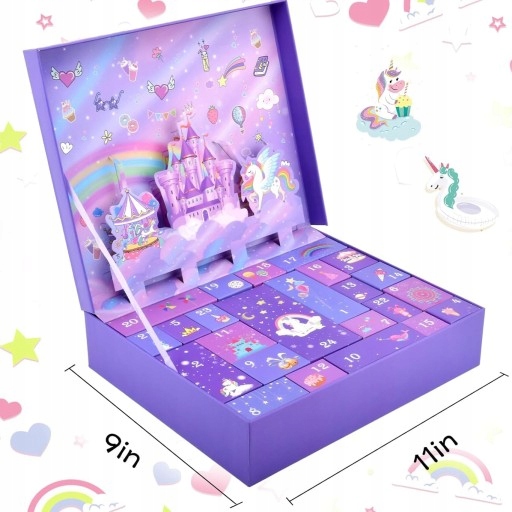 W wykwintnym pudełku znajdują się 24 różne prezenty, dzięki czemu dzieci mogą doświadczyć różnych niespodzianek w każdym dniu odliczania. Każdy prezent jest dostarczany w osobnym pudełku, a jednorożce, kokardy, kwiaty, tęcze i chmury to elementy, które dzieci pokochają.
