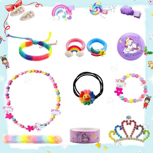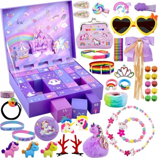Ten zestaw modnych akcesoriów bożonarodzeniowych zawiera 24 prezenty-niespodzianki z odliczaniem do Świąt, w tym portfele, silikonowe bransoletki, pierścionki z jednorożcem, naszyjniki, spinki do włosów, akcesoria do włosów, bransoletki, naklejki i wiele innych.
