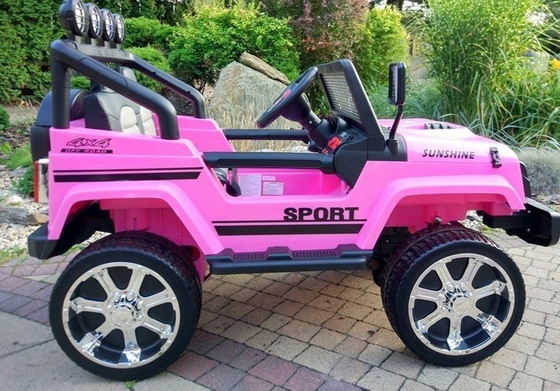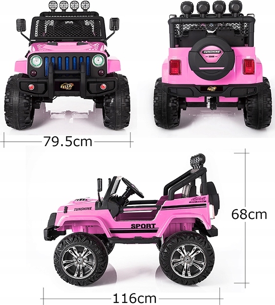 Mega Jeep Sunshine Sport je vrhunski otroški avtomobil na akumulator z 24V močjo in 180W, ki bo navdušil male voznike. Ta rožnati model je opremljen s štirimi 45 W motorji, mehkimi kolesi EVA in 2,4 GHz pilotom z funkcijo varnega zaviranja. Vozilo ima težo 23 kg, največje obremenitev 40 kg ter številne dodatke, kot so mehko sedež, odpirajoča se vrata, amortizerji, pasovi varnosti, radio FM, MP3 predvajalnik, Bluetooth in številne druge funkcije. Z napajanjem preko dveh 12V/7Ah akumulatorjev je vožnja tiha in udobna, primerna za vožnjo po različnih površinah. S funkcionalnim pilotom 2,4 GHz s tremi hitrostmi in možnostjo takojšnjega zaviranja je varnost vedno zagotovljena. Jeep Sunshine Sport je idealen za vožnjo po travi, neravnih terenih in dvoriščih. Z do 1-urnim časom vožnje je zagotovljena dolga zabava za otroke od 3 do 6 let. Akumulator in polnilec sta priložena, vozilo pa je enostavno za montažo. Ne pozabite, da je vožnja vedno potrebno izvajati pod nadzorom odrasle osebe in upor