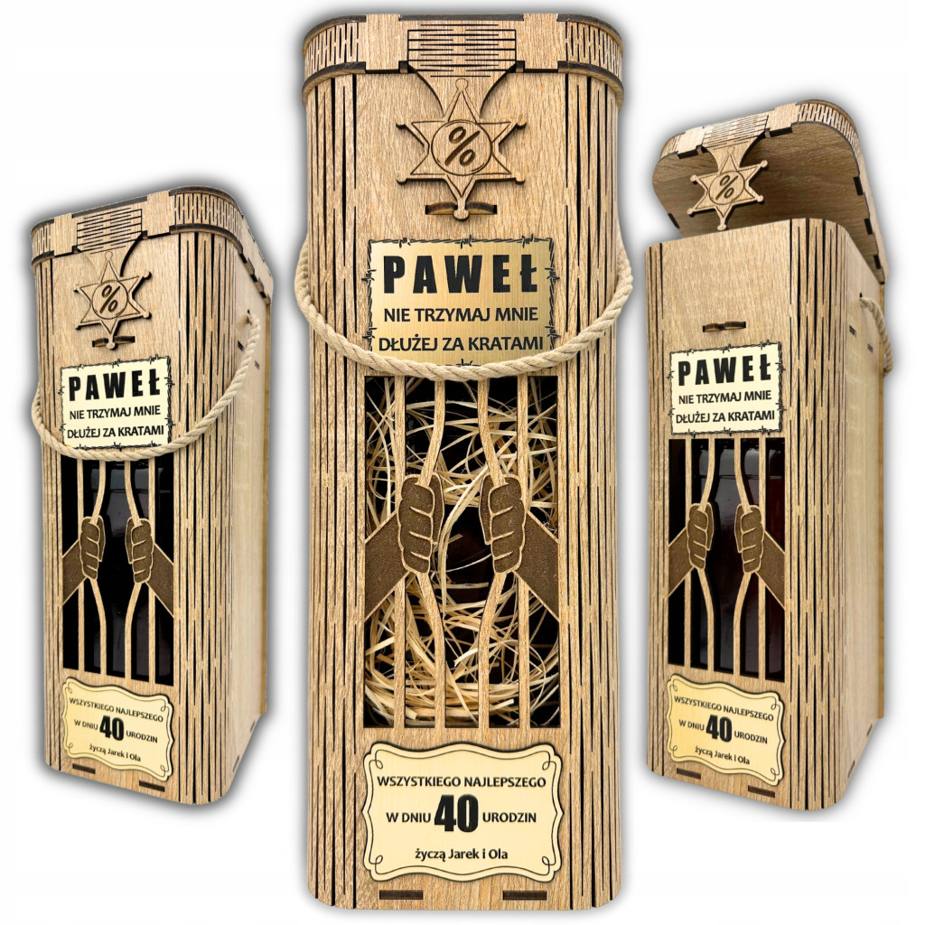 Nasza personalizowana skrzynka na alkohol nie tylko pięknie opakowuje ulubioną butelkę, ale także w humorystyczny sposób nawiązuje do więziennego motywu, co czyni ją niezapomnianym prezentem na każdą okazję.