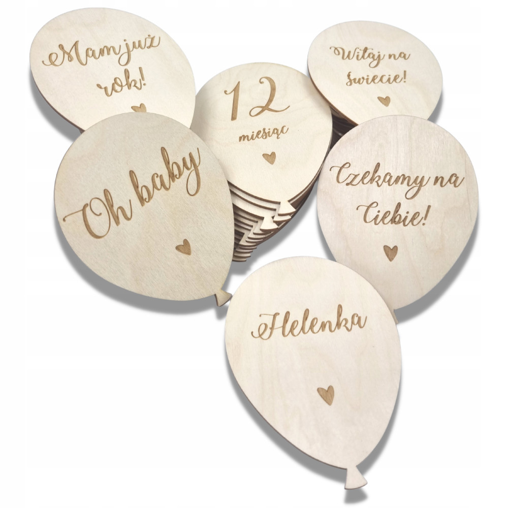 Komplet drewnianych tabliczek do zdjęć dokumentujących pierwsze 12 miesięcy życia. Komplet składa się z aż 20 tabliczek. 12 z nich poszczególnymi miesiącami, jedna "Mam już roczek", "Już jestem!", "Czekamy na Ciebie", "Nareszcie razem!", "Moje pierwsze kroki", "Moje pierwsze święta", "Pierwszy dzień w domu" oraz ostatnia z personalizowanym imieniem dziecka.