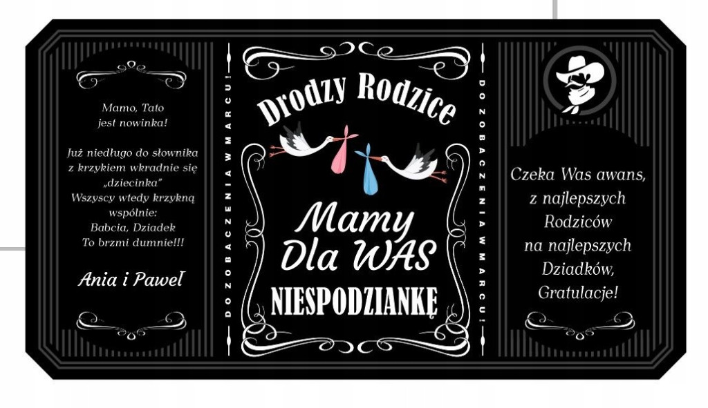 Etykieta na alkohol dla smakosza Jacka Daniels'sa. Etykieta w pełni personalizowana, wydrukowana na folii samoprzylepnej, dzięki temu bez problemu można ją samemu nakleić na butelkę. Ta aukcja dotyczy zakupu etykiety na butelkę o pojemności 0,5l, jeśli interesują Cię inne pojemności butelki to sprawdź nasze pozostałe aukcje. Idealny pomysł, aby powiadomić Rodziców o powiększeniu się rodzinki- o ciąży.