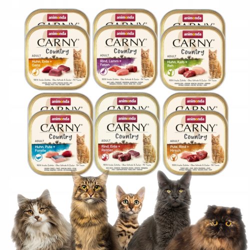Animonda Carny Country MIX SMAKÓW to zestaw mokrej karmy dla kotów, który składa się z wysokiej jakości mięsnych kompozycji. Każde opakowanie zawiera starannie dobrane składniki, które zapewniają zbilansowaną dietę oraz wyjątkowy smak. Idealne dla kotów dorosłych, które wymagają różnorodności w swojej codziennej diecie.