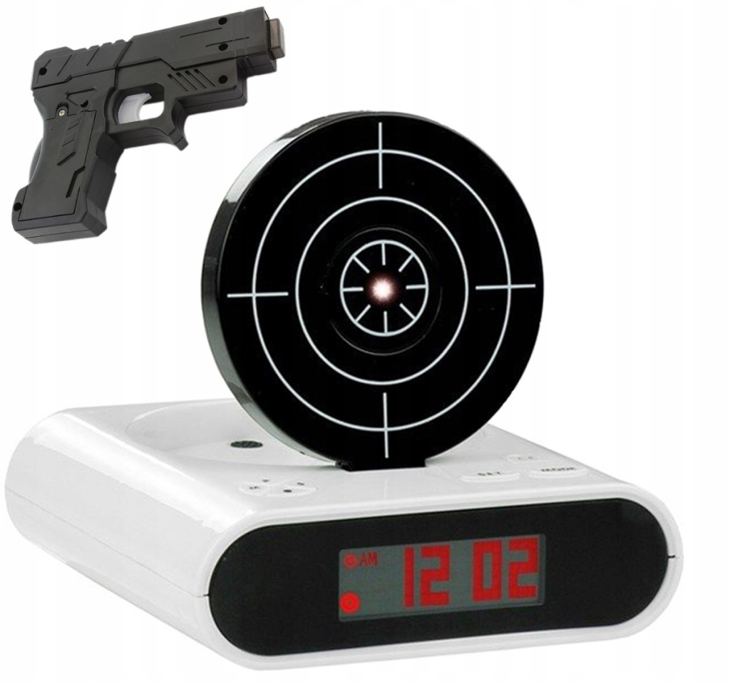 ✅ Jedyna możliwość wyłączenia ustawionego alarmu (domyślnego bądź też własnego, wcześniej nagranego i wystarczająco irytującego dźwięku) to wycelowanie pistoletem (pilotem) w stronę tarczy i skierowanie na niej wiązki podczerwieni.