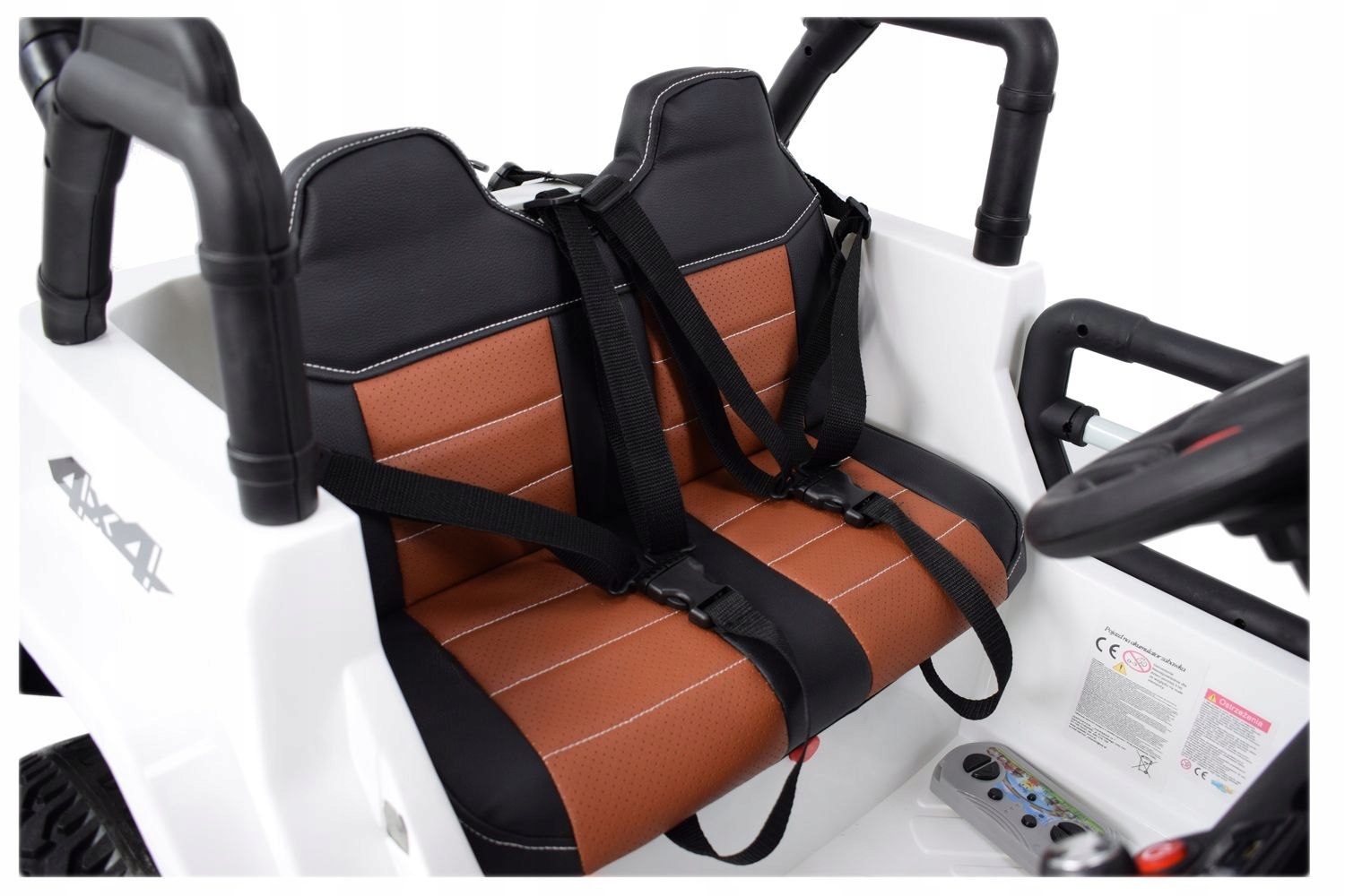 Napęd: Cztery silniki 45 W - napęd na cztery koła z systemem wolnego startu 12000 RPM Zasilanie: Akumulator 2x12V 10 Ah Ładowarka: 220-240 V 50 Hz 12V DC 1000 MA Pilot: Tak, sterownie przód/tył, lewo/prawo z pełną kontrola rodzicielską czyli w każdej chwili może użyć przycisk STOP (P) na pilocie dzięki czemu auto natychmiast się zatrzyma. Dodatkowo z pilota rodzic może ustawić prędkość pojazdu 1,2,3 NOWOCZESNY PILOT BEZZAKŁÓCENIOWY częstotliwość 2,4GHz z funkcją wyłączania się po czasie, gdy nie jest używany. Pasy bezpieczeństwa Tak dla 2 małych dzieci Miękkie koła EVA Tak Wymiary pojazdu: długość ok: 139 cm,szerokość przy kołach tylnych ok. 82 cm, wysokość przy światłach na pałąku ok.: 82 cm, wysokość przy kierownicy ok : 71 cm, wysokość przy siedzeniu ok.: 67 cm, wysokość drzwi ok.: 55 cm, szerokość siedziska ok.:46 cm, odległość od pedału gazu do siedzenia ok.:63 cm, średnica koła ok.: 35 cm, szerokość koła ok.: 16 cm, prześwit od podłoża do progu ok.: 22 cm - bardzo wysoko, Max obciążenie pojazdu 35 kg Waga pojazdu ok. 32 kg Prędkość i jazda łącznie 3 prędkości jazdy ustawiane z pilota bieg wolny 2,5- 3 km/h, bieg szybki do 5-7 km/h, jazda w przód i w tył, idealny pojazd na trawę, działkę czy nierówności - napęd na cztery koła, Komfort jazdy: Napęd 2x2 lub 4x4 z reduktorem napędu który automatycznie załącza napęd 4x4, miękkie koła, SYSTEM WOLNEGO STARTU i SYSTEM HAMOWANIA, otwierana maska, otwierane koło zapasowe, pasy dla dwójki dzieci, amortyzatory z przodu i z tyłu , uchwyt do holowania Efekty świetlne Tak, światła przednie, światła tylne ( z możliwością wyłączenia) , wskaźnik naładowania akumulatora, podświetlana deska Hamowanie Pojazd hamuje silnikiem po zdjęciu nogi z gazu oraz posiada HAMULEC w pilocie po jego naciśnięciu zatrzymuje się natychmiast i blokuje możliwość uruchomienia przez dziecko -najbezpieczniejsza z opcji Efekty dźwiękowe: Tak, głos pracy silnika, klakson, piosenki dyskotekowe bardzo melodyjne, regulacja głośności, wejście MP3, USB, slot na kartę wgrane opowieści , sterowanie panelem za pomocą przycisków w kierownicy Regulacja głośności: Tak w panelu po lewej stronie kierownicy Kontrolka naładowana baterii Tak - kontrolka LED - wyświetla obecne napięcie Czas ładowania: 8 do 12 godzin, przed pierwszym użyciem należy ładować akumulator około 18 godzin Dodatkowe funkcje: Dźwięki klaksonu, melodie , dźwięk uruchamiana silnika oraz system wolnego startu, przycisk hamulca na pilocie, nowoczesny pilot 2,4 Ghz z funkcją automatycznego wyłączania się.Miękkie koła EVA, miękkie siedzenie, reduktor pracy silników 2x2 lub 4x4 Gwarancja: pisemna 12 miesięcy Wymiar opakowania 143 cm x 73 cm x 44 cm Waga z opakowaniem. 35 kg Wysyłka i montaż: Pojazd do montażu wysyłany w oryginalnym kartonie - czas montażu ok 15-25 minut. Tablica przód: 12 cm x 4 cm Tablica tył: 12 cm x 3 cm
