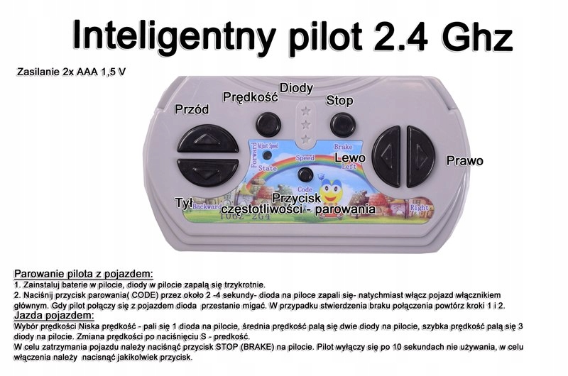 sterowany z za pomocą inteligentnego pilota 2,4 Ghz pilota z możliwością kontroli prędkości przez Rodzica i z możliwością zahamowania za pomocą pilota - NOWOŚĆ.