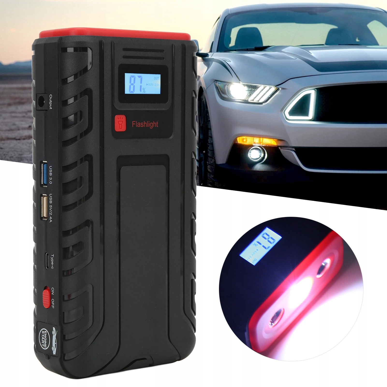 1. Szerokie zastosowanie: uruchamianie większości pojazdów średniej wielkości 12 V na drogach, takich jak samochody, motocykle, jednostki pływające, quady, UTV, SUV-y, kosiarki do trawy, jachty, łodzie, pickupy, skutery śnieżne itp. 2.9 Zabezpieczenia: Funkcja 9 zaawansowanych technologii bezpieczeństwa, w tym ochrona nadprądowa, ochrona przed przeciążeniem, ochrona przed przepięciami, ochrona przed przeładowaniem i ochrona przed wysoką temperaturą itp. 3. Szybkie ładowanie QC3.0: Dwa porty USB mogą ładować urządzenia szybciej i wydajniej oraz są kompatybilne z prawie wszystkimi urządzeniami ładującymi USB takich jak telefony komórkowe, tablety, Kindle lub aparaty cyfrowe. 4. Jasna latarka LED: Światło robocze LED ma 3 tryby: lampa błyskowa, światło stroboskopowe i światło SOS. Ta wielofunkcyjna latarka jest idealna do biwakowania, na zewnątrz, w pomieszczeniach zamkniętych, w sytuacjach awaryjnych, w podróży itp. 5. Funkcja: rozwiąż problem polegający na tym, że pojazd nie może się uruchomić, ponieważ samochód jest pozostawiony na dłuższy czas, akumulator jest zużyty, napięcie jest niewystarczająca zimą lub gdy akumulator jest rozładowany w polu. 6,18000 mAh Duża pojemność: Wbudowane cztery akumulatory 7043125 o wysokiej wydajności z inteligentnym układem zasilania, bardziej stabilne i bezpieczne, bez uszkodzeń pojazdu i sprzętu cyfrowego. 7. Wysoka wydajność: kompaktowy i przenośny oraz wszechstronny w użyciu. Statyczne rozwiązanie uśpienia o niskim natężeniu prądu 0,05 mA może utrzymać moc po długotrwałym użytkowaniu i może normalnie pracować w bardzo niskich temperaturach