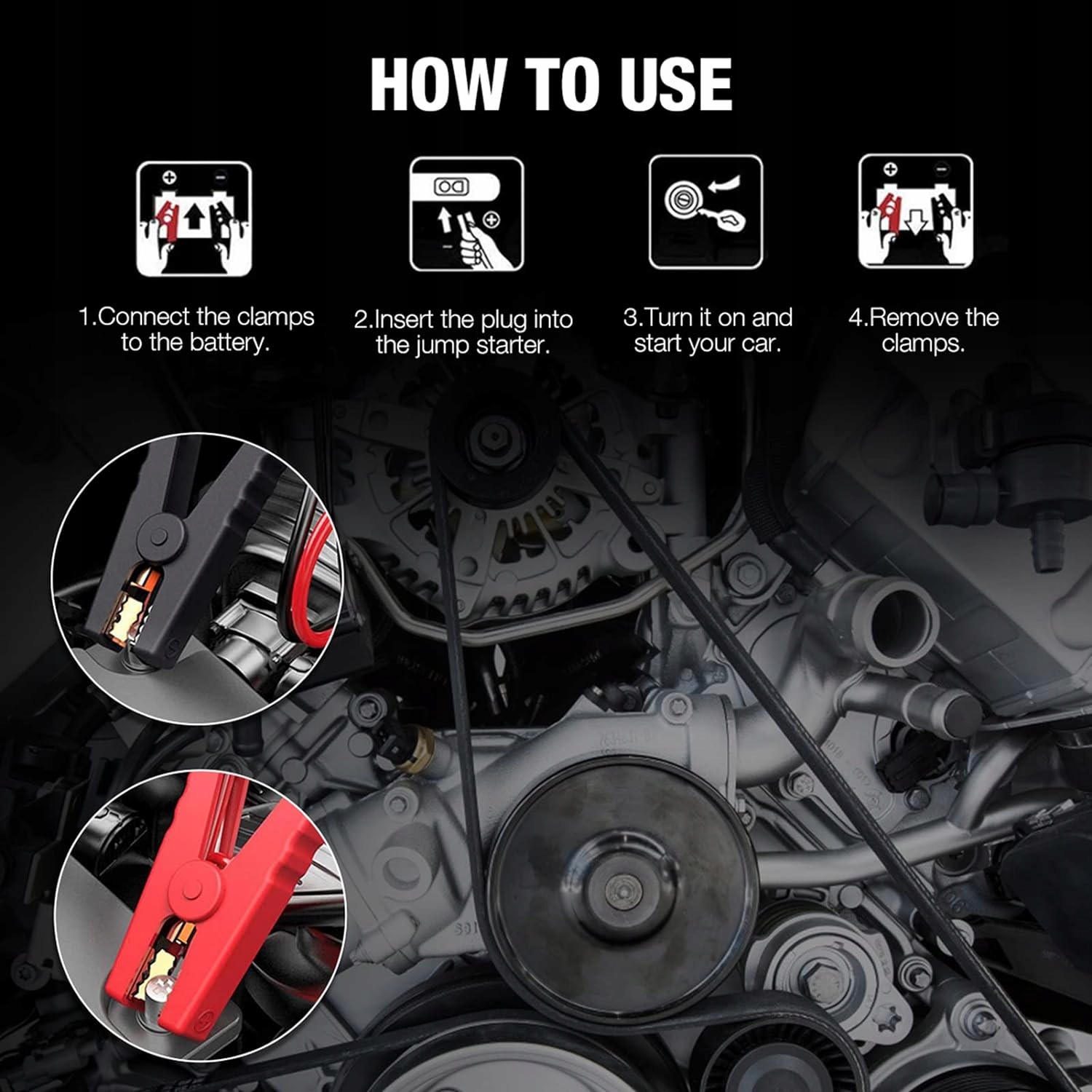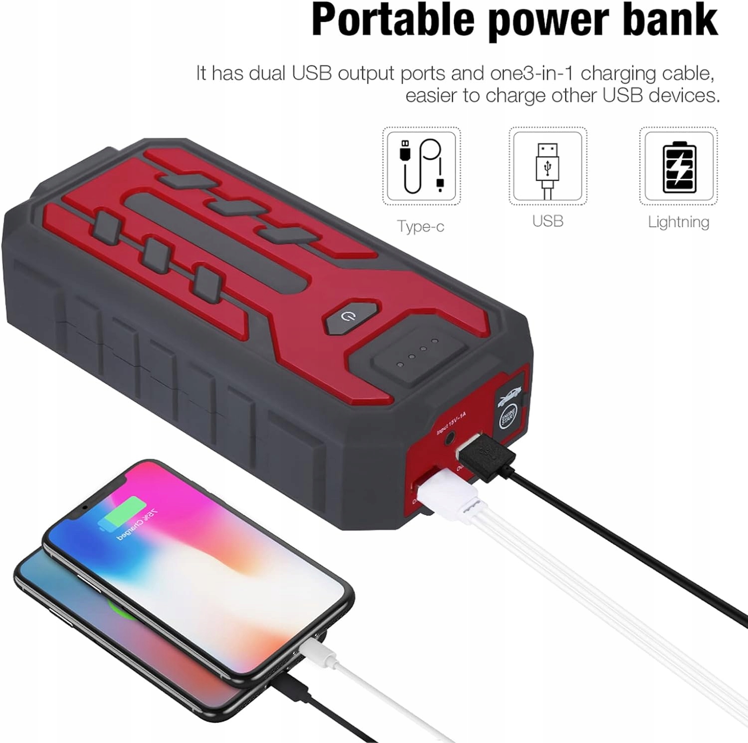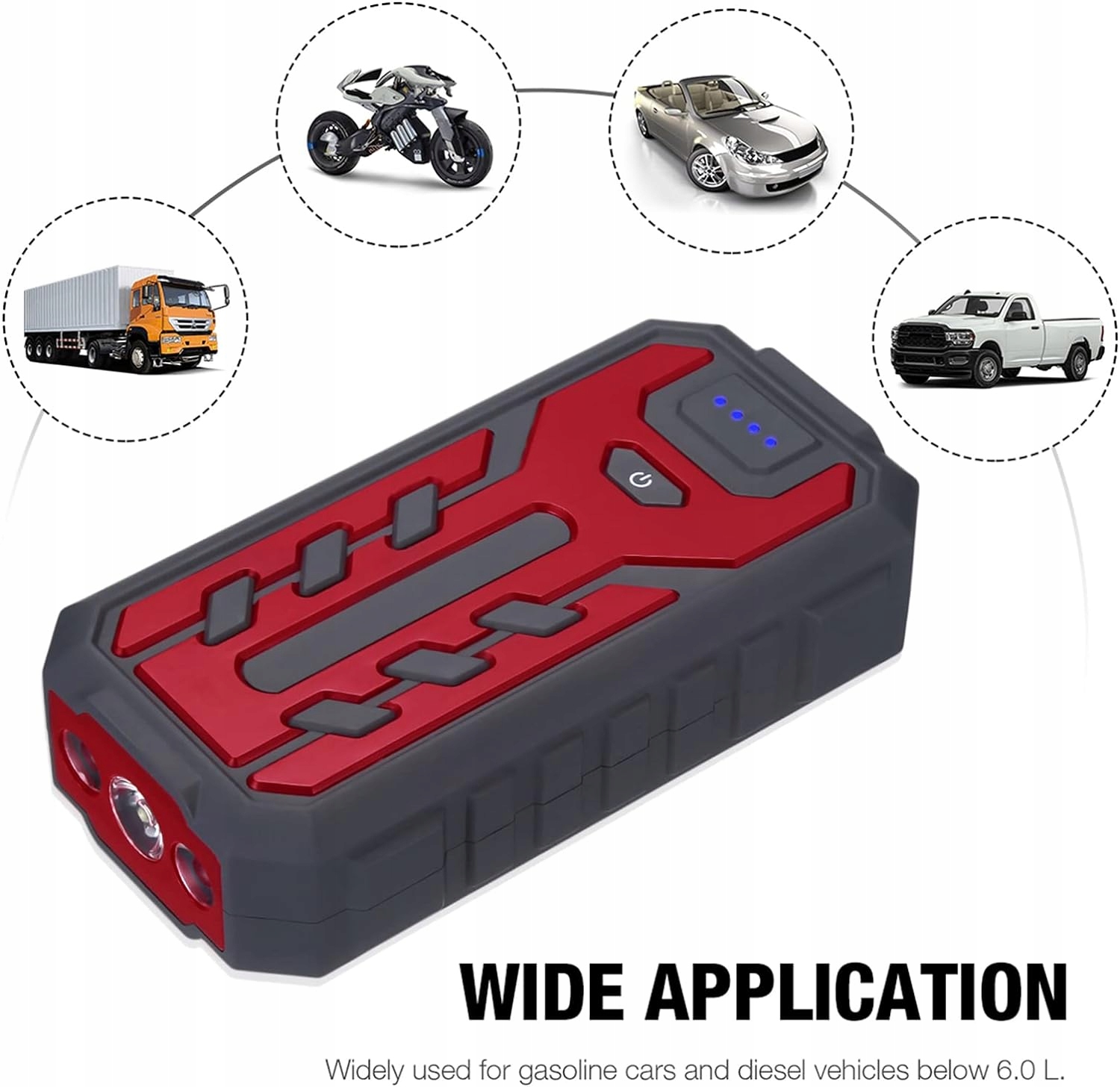Potężne urządzenie do uruchamiania awaryjnego samochodu Urządzenie do uruchamiania awaryjnego samochodu może uruchomić samochody 12 V w tym silnik benzynowy 65 l lub silnik wysokoprężny 30 l w trudnych temperaturach od 40 do 80 C SUVy ciężarówki lub samochody dostawcze do 30 razy na pełne naładowanie. Ochrona bezpieczeństwa 8 zaawansowanych technologii zabezpieczeń zapobieganie odwróceniu zwarcie przepięcie przegrzanie przeładowanie nadmierne rozładowanie przetężenie wyjątkowo niskie zużycie energii rozruszniki awaryjne samochodu zapewniają najwyższą ochronę. Wielofunkcyjny To urządzenie do uruchamiania awaryjnego samochodu przenośny power bank latarka LED i przenośny zasilacz 12 V. Ładuj smartfony tablety i inne urządzenia USB. Można go łatwo ładować z dowolnego zasilanego portu USB. Awaryjne światło LED Wbudowana bardzo jasna latarka LED przenośna i trwała wyposażona w 3 tryby LED do oświetlenia w sytuacjach awaryjnych. Przenośny i wygodny W przeciwieństwie do tradycyjnych nieporęcznych zestawów do rozruchu jest wystarczająco mały aby przechowywać go w schowku i wystarczająco lekki aby zapakować go do torby.