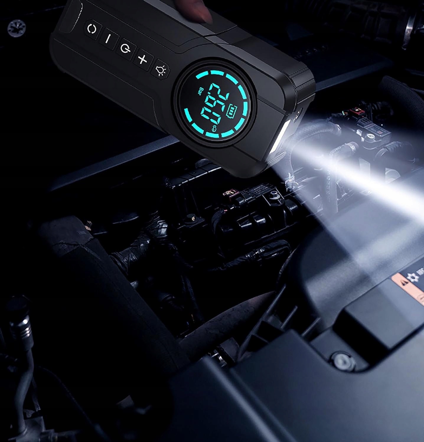 WYDAJNY ROZRUSZNIK AWARYJNY AKUMULATORA 1000 A Ten rozrusznik awaryjny akumulatora samochodowego może uruchomić pojazd 12 V w ciągu 36 sekund przy prądzie szczytowym 1000 A i inteligentnym klipsie DUŻA POJEMNOŚĆ 8400MAH Przenośny samochodowy powerbank z rozrusznikiem awaryjnym ma dużą pojemność 8400mAh napięcie wejściowe i prąd wynoszą 12V 2A może szybko naładować telefon komórkowy i inne produkty elektroniczne czyniąc życie wygodniejszym WIELOFUNKCYJNY Ulepszony rozrusznik awaryjny samochodu jest lekki i przenośny może oświetlać drogę w nocy lub wysyłać sygnał alarmowy jednocześnie może służyć jako inflator do pompowania opon. Posiada zabezpieczenie przeciwzwarciowe zabezpieczenie nadprądowe ochronę oprogramowania i sprzętu ZASILANIE WYPOSAŻENIA SAMOCHODOWEGO NA 12 V Ten przenośny rozrusznik awaryjny ma wyjście 12 V2 A można go z łatwością używać do zasilania odkurzaczy samochodowych sprężarek powietrza lodówek samochodowych i innego sprzętu samochodowego 12 V a ekran LCD może dokładnie wyświetlać ciśnienie powietrza lub pozostała moc SERWIS