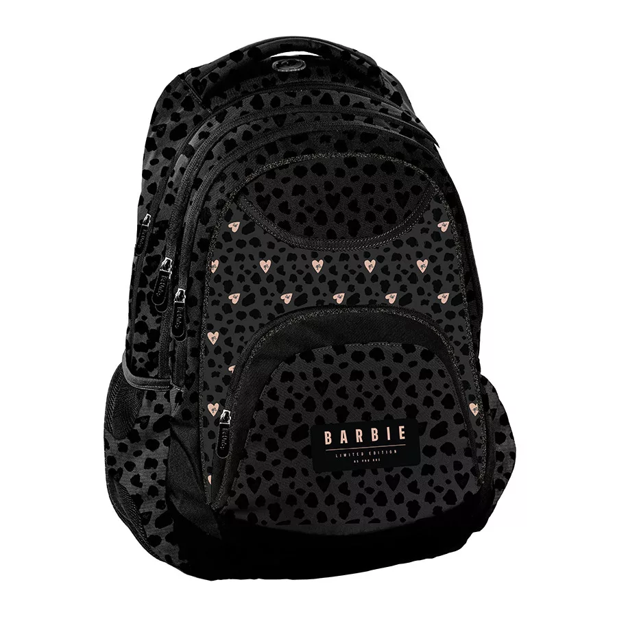 Plecak młodzieżowy Barbie BeUniq . Posiada trzy pojemne komory, kieszeń przednią z organizerem zamykaną na zamek oraz dwie boczne kieszonki, wykonane z siatki i materiału, które pomieszczą butelkę, bidon czy termos. W komorze głównej, znajduje się przegroda (na laptop). W drugiej komorze organizer z kieszenią na zamek oraz uchwyt na klucze. Wzmocnione profilowane plecy oraz miękkie, regulowane szelki sprawią, że plecak nosi się niezwykle komfortowo. Plecak posiada wygodny uchwyt do przenoszenia, uszko do powieszenia oraz elementy odblaskowe dla większego bezpieczeństwa na drodze po zmroku. Model zawiera usztywniony i wzmocniony spód. Ze względu na swój rozmiar, plecak ten to idealne rozwiązanie dla nastolatków, jak i dla młodszych dzieci.