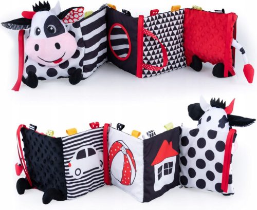 Sensoryczna, miękka, szeleszcząca książeczka z podobizną krowy sprawdzi się idealnie zarówno w domu, jak i w podróży.