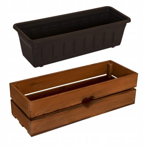 Wewnątrz znajduje się plastikowa doniczka idealnie pasująca do skrzynki.