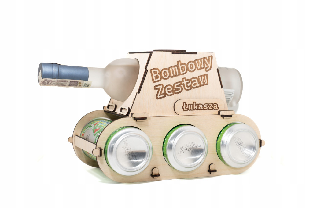 Szukasz wyjątkowego prezentu na alkohol? Nasze drewniane opakowanie w kształcie czołgu to oryginalny sposób na wręczenie butelki ulubionego trunku! To kreatywny zestaw prezentowy, który pomieści zarówno butelkę, jak i puszki, idealny na różne okazje – od urodzin po wieczory kawalerskie.