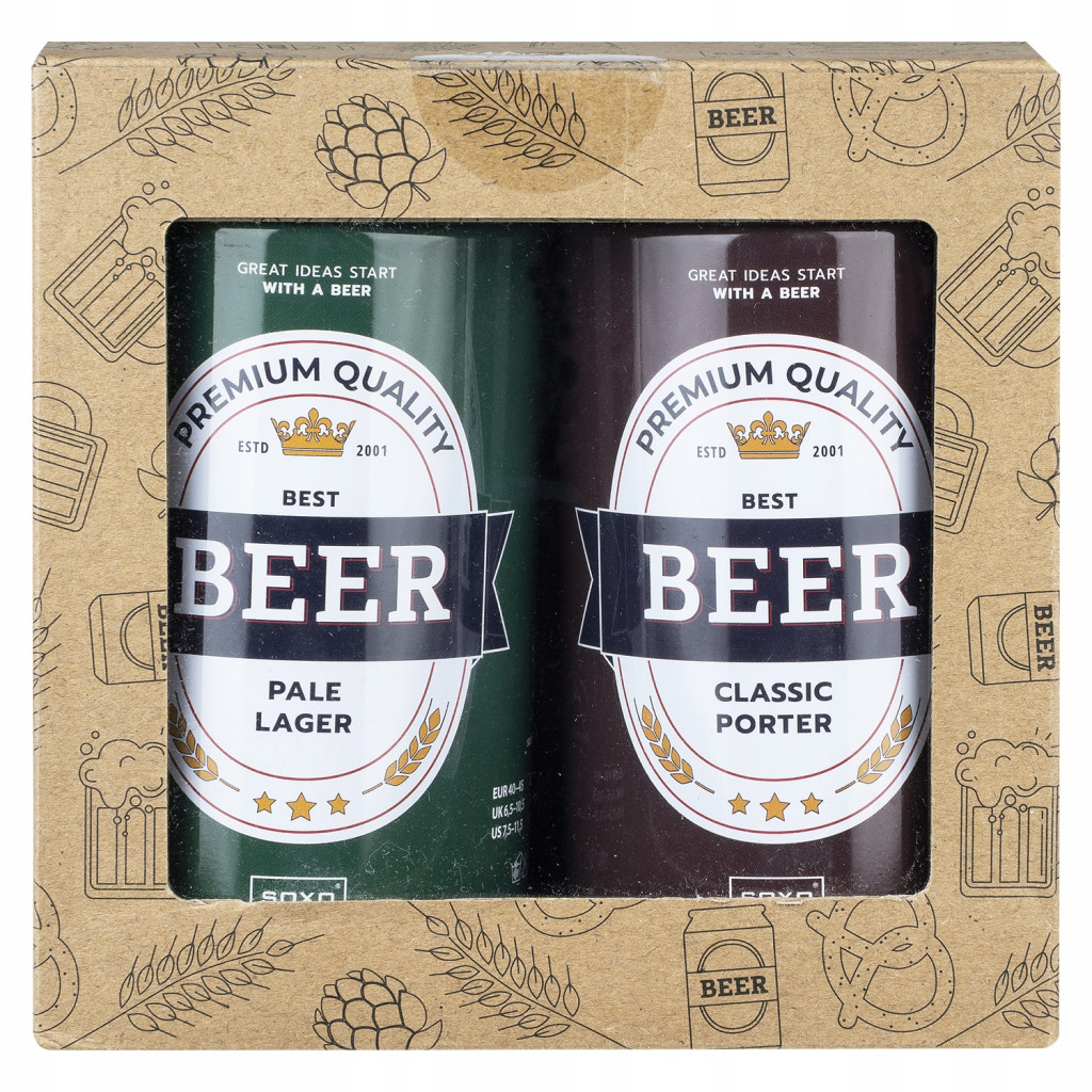 ➡️ Zestaw dwóch par skarpetek męskich wykonanych z wysokiej jakości bawełny, ozdobionych oryginalnymi wzorami inspirowanymi różnymi rodzajami piwa: Pale Lager i Classic Porter. ???????? Skarpetki są starannie zapakowane w metalowe puszki przypominające puszki po piwie, co czyni je świetnym pomysłem na prezent dla każdego miłośnika piwa. ????