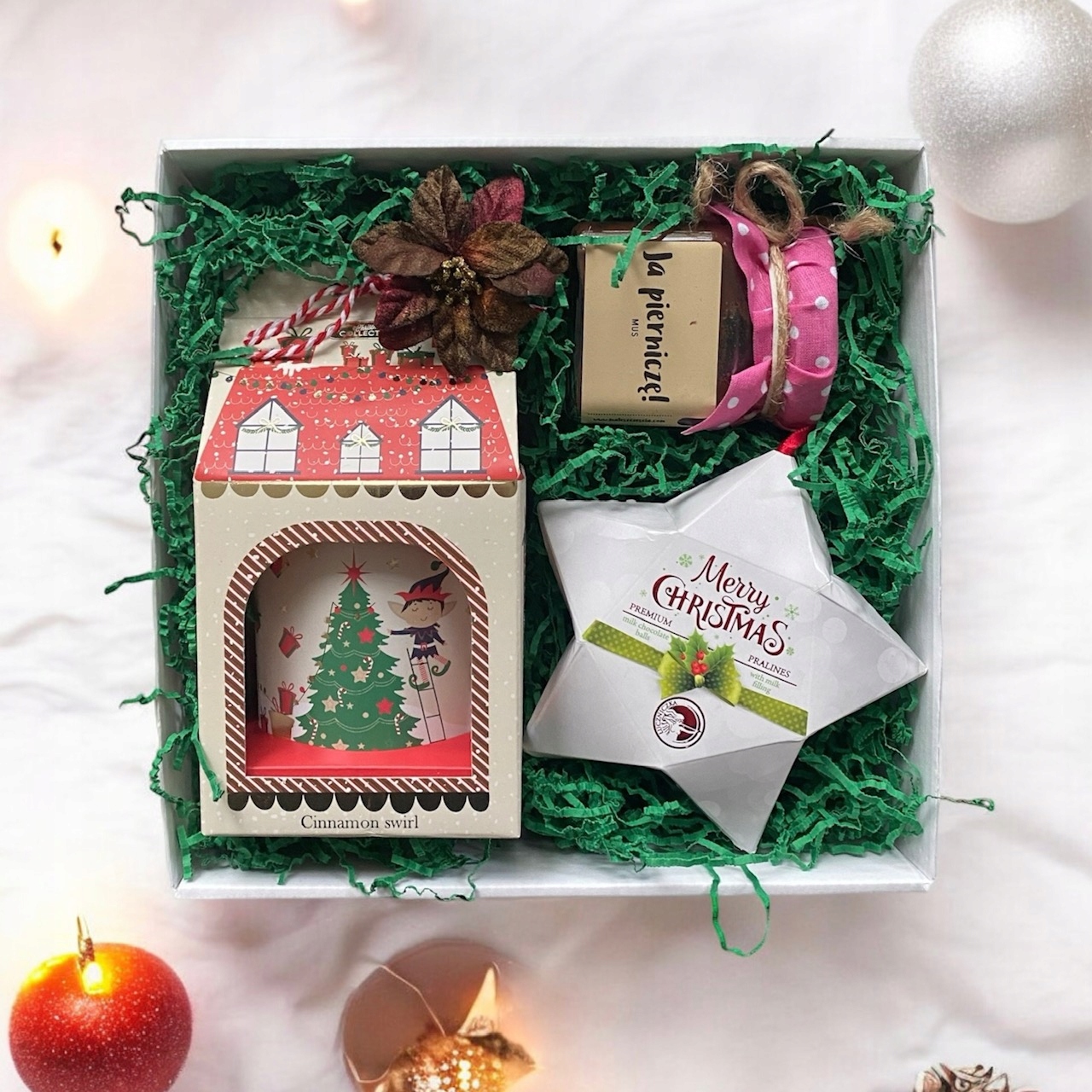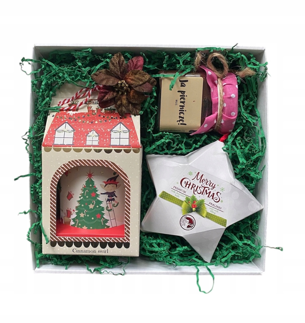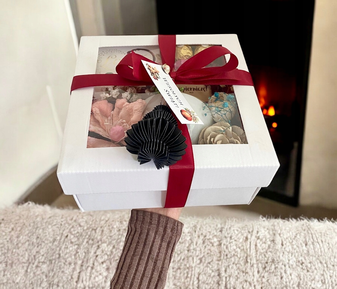 Całość zapakowana w eleganckie pudełko wykonane z tektury w rozmiarze 20x20x10, wypełnione ekologicznymi wiórkami, przewiązane ozdobną wstążką.