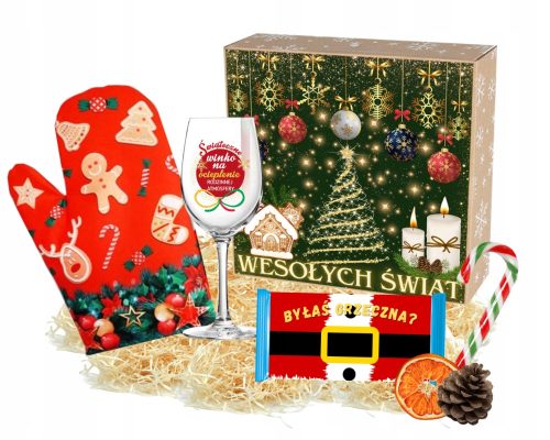 Szklany kieliszek na wino z dopasowanym świątecznym nadrukiem 'Świąteczne winko na ocieplenie rodzinnej atmosfery' Kieliszek zapakowany w ozdobny kartonik, gotowy do wręczenia na prezent!