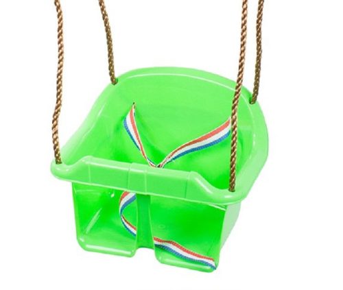 Huśtawka dziecięca plastikowa z barierką zabezpieczającą przed wypadnięciem lub wysunięciem się dziecka.