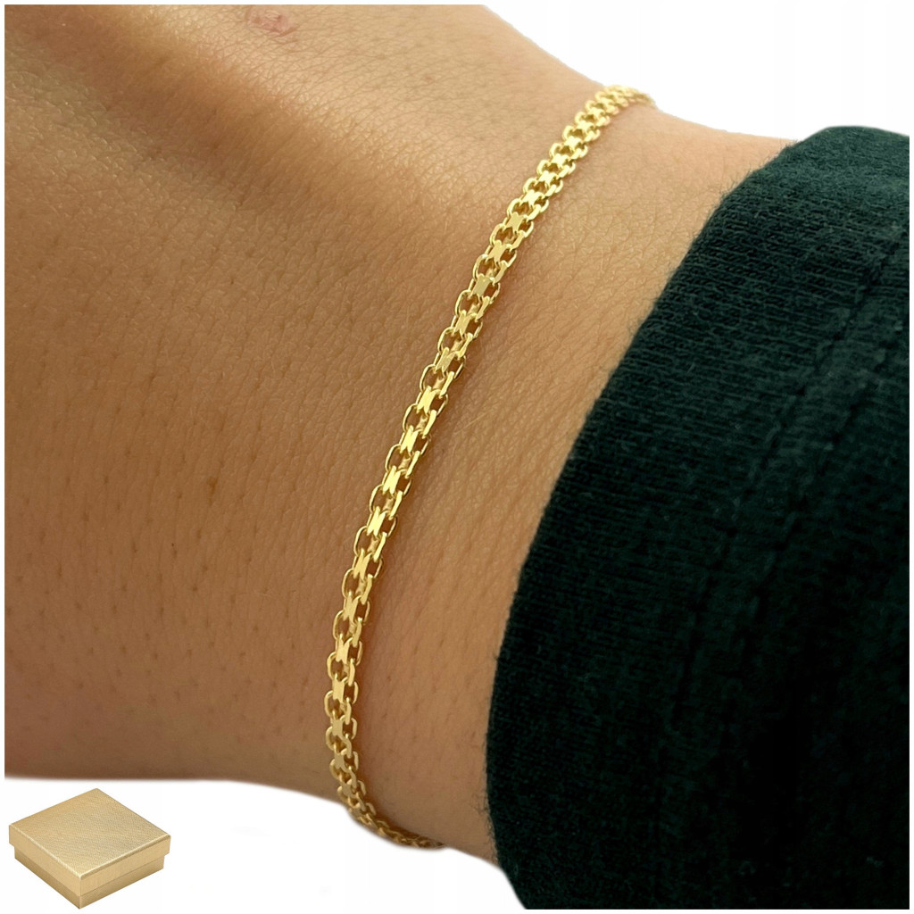 ✨ Przedstawiamy państwu delikatną, damską bransoletkę o splocie bismark. Produkt został wykonany z najwyższej jakości srebra próby 925. Całość została dodatkowo pokryta prawdziwym 14 karatowym złotem próby 585. Ten model bransoletki z pewnością doceni każda kobieta. Produkt jest solidny i wytrzymały, więc z pewnością posłuży długi czas.
