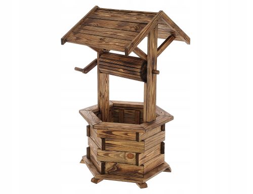 Stylowa studnia do ogrodu. Wykonana z drewna sosnowego, opalana i pokryta impregnatem w kolorze dąb. Studnia nie wymaga dodatkowego zabezpieczenia. Studnia nie posiada dna. Idealnie sprawdzi się w ogrodzie jako donica na kwiaty.