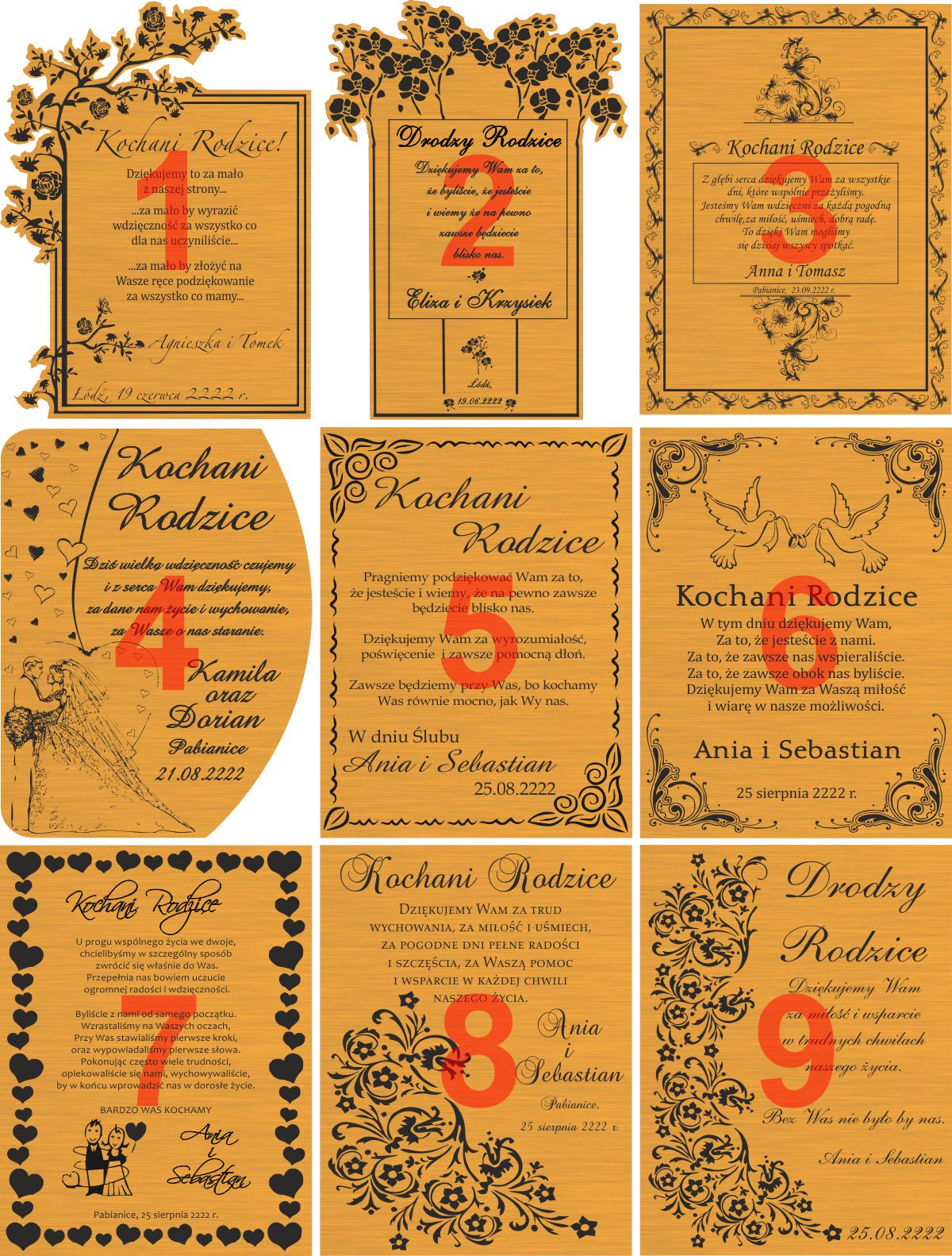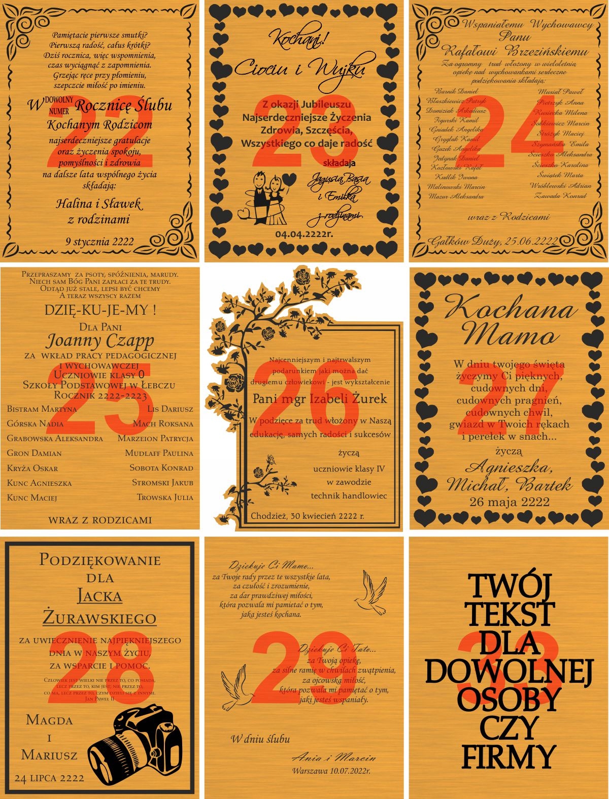 Masz problem z podjęciem decyzji jaki prezent wybrać na podziękowania dla rodziców? Idziesz na rodzinną imprezę i nie wiesz co kupić jubilatowi / solenizantowi? Kup ten dyplom! Jest to gruba i pięknie wykończona deska z grawerowanym laminatem na stałe złączonym z dyplomem. Do zestawu dołączony jest stojak, a z tyłu dyplomu są wykonane otwory do zawieszenia na ścianie. Grawer jest wykonywany na nowoczesnych maszynach.