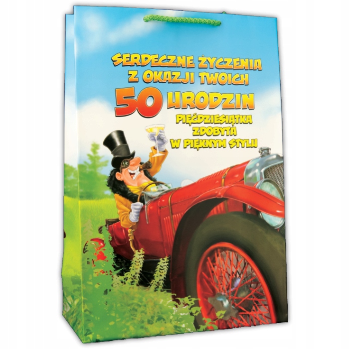 Elegancka torebka prezentowa z dopasowanym śmiesznym napisem z okazji 50 urodzin. Torebka wykonana z grubego, lakierowanego papieru.