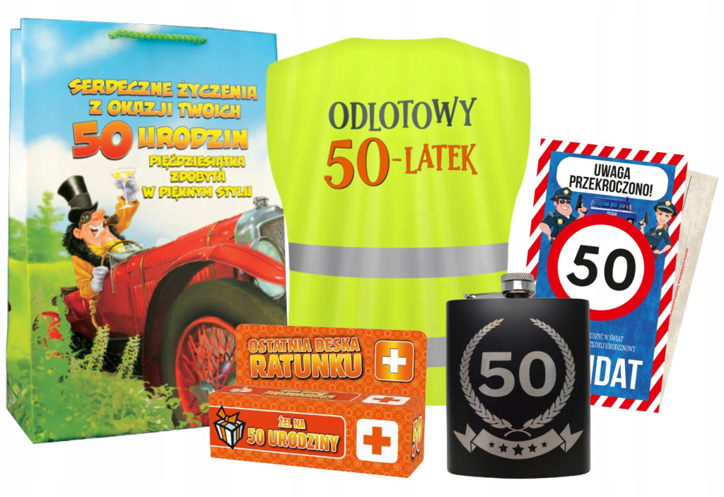 Z przodu umieszczona została zabawna grafika oraz tekst "UWAGA PRZEKROCZONO 50! ABY DALEJ RUSZYĆ W ŚWIAT OBOWIĄZKOWO PRZYJMIJ URODZINOWY MANDAT".