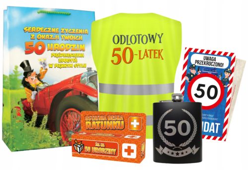 Gotowy zestaw urodzinowy, w którym znajduje się piersiówka, kamizelka odblaskowa, kartka-mandat, mydełko antybakteryjne oraz torebka na prezenty.