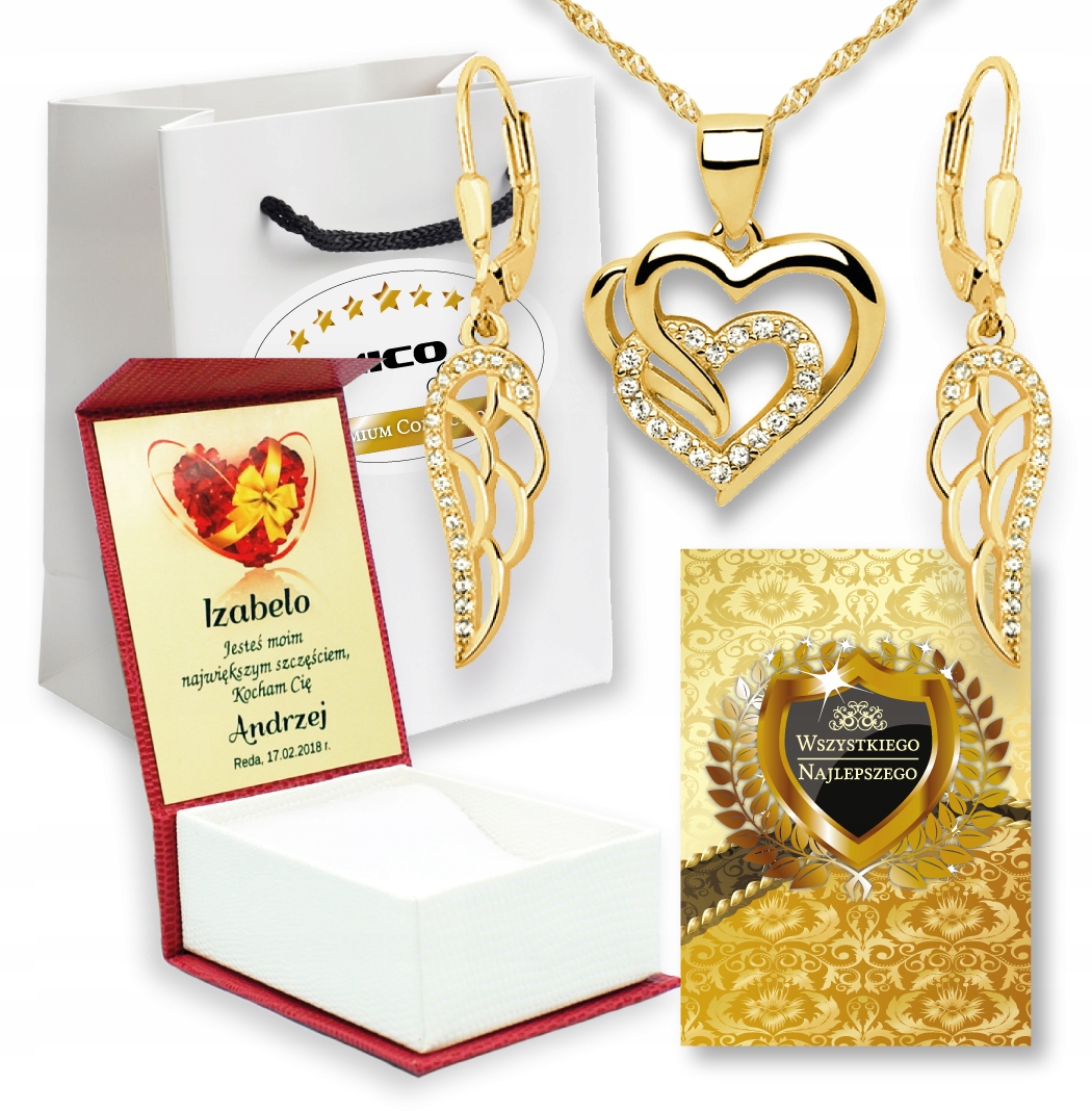 Piękna symboliczny komplet w kształcie serduszek oraz skrzydeł z cyrkoniami nadaje się idealnie na prezent dla wyjątkowej osoby.