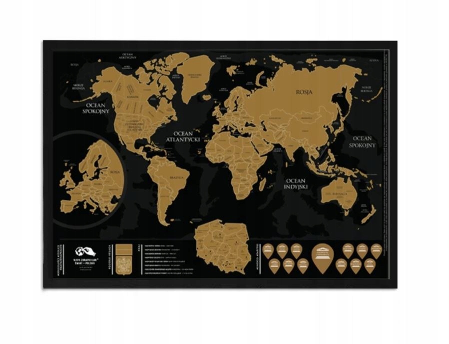 Mapa Zdrapka DELUXE© to ekskluzywna wersja mapy zdrapki, dostępna tylko u nas. Jest to produkt doskonałej jakości, wyprodukowany w Irlandii, zaprojektowany i pakowany w Polsce. Jest w przepięknych kolorach: ma czarne tło oceanów i pastelowe barwy kontynentów ukryte pod złotą warstwą zdrapki. U dołu mapy znajduje się zdrapka wraz z ciekawostkami i największymi atrakcjami turystycznymi.