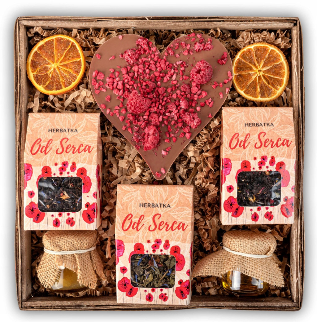 Dodatkowo, w koszu znajduje się również czekolada mleczna naturalna, która jest delikatna i rozpuszczalna w ustach, a także miód z konfiturą pomarańczową tworząc doskonałe połączenie smaków. Każdy element został wybrany z największą dbałością o jakość, smak i efekt wizualny prezentu.