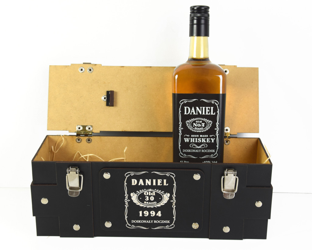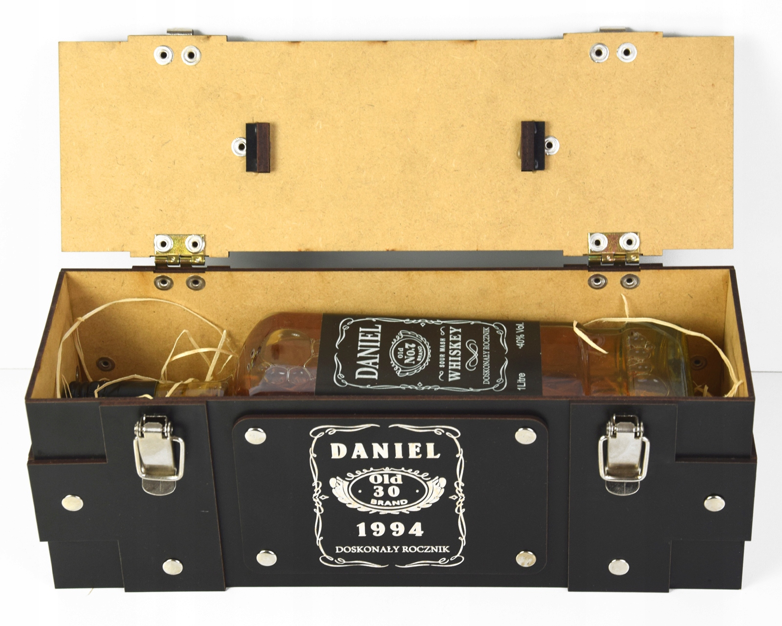 Spersonalizowany wyjątkowy prezent idealny na każdą okazję. Obdarowana osoba będzie mile zaskoczona Twoją pomysłowością, a także na pewno zadowolona. Wyjątkowa skrzyneczka w zestawie z pustą butelką 1L i spersonalizowaną etykietą. Pudełko wewnątrz zawiera wełnę drzewną, więc wszystko co musisz zrobić to napełnić butelkę ulubionym trunekiem obdarowywanej osoby. Skrzyneczka ta jest elementem dekoracyjnym dlatego też śmiało może być eksponowana na komodzie, biurku lub gablocie.