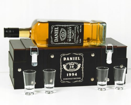 Spersonalizowany wyjątkowy prezent idealny na każdą okazję. Obdarowana osoba będzie mile zaskoczona Twoją pomysłowością, a także na pewno zadowolona. Wyjątkowa skrzyneczka w zestawie z pustą butelką 1L czterema kieliszkami i spersonalizowaną etykietą. Pudełko wewnątrz zawiera wełnę drzewną, więc wszystko co musisz zrobić to napełnić butelkę ulubionym trunekiem obdarowywanej osoby. Skrzyneczka ta jest elementem dekoracyjnym dlatego też śmiało może być eksponowana na komodzie, biurku lub gablocie.