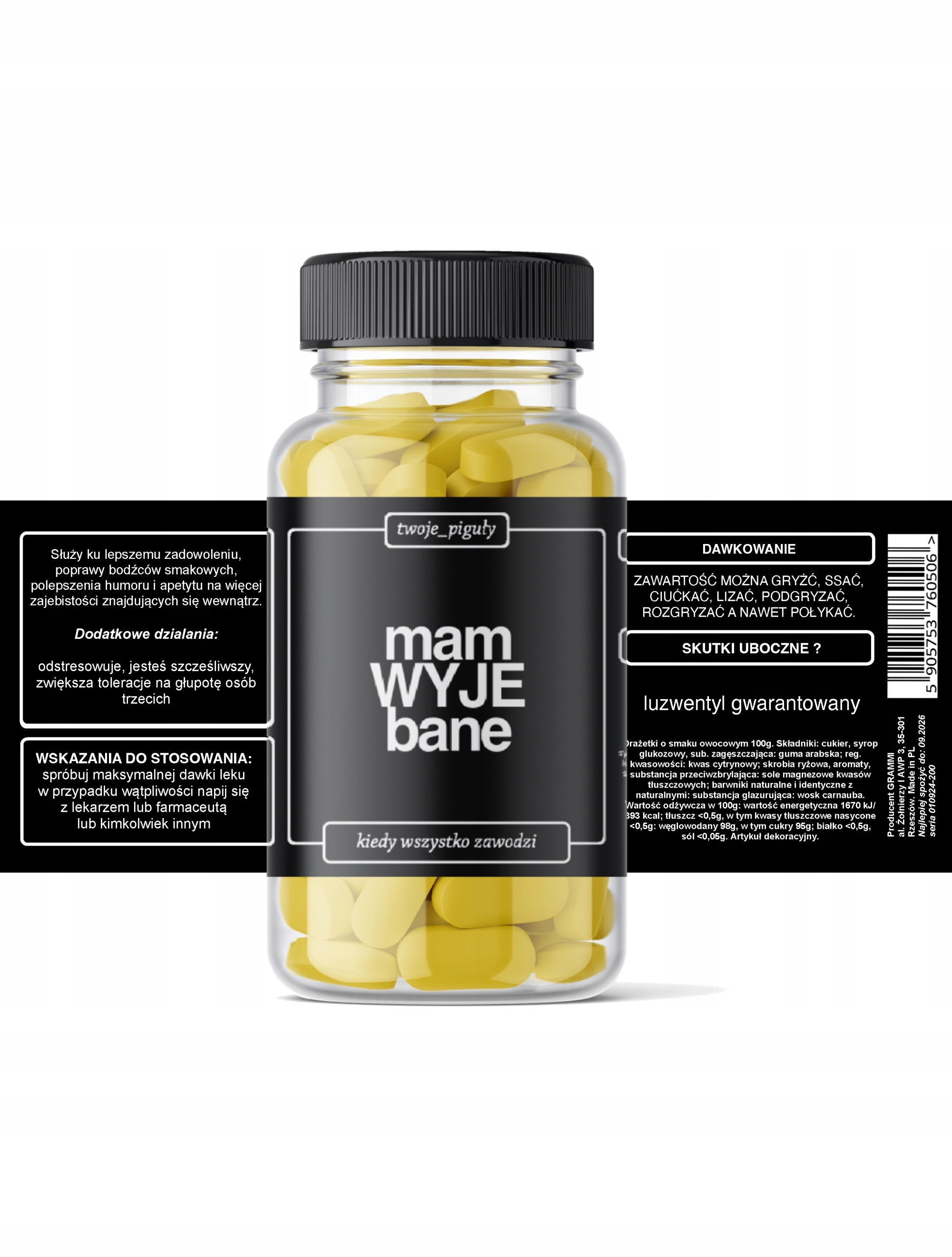 Oryginalne drażetki owocowe, w kształcie tabletek. Zamknięte w odkręcanym opakowaniu z zabawną etykietą "mamWYJEbane". Idealnie sprawdzą się jako humorystyczny dodatek do prezentu.