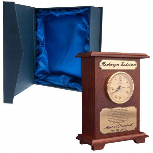 Piękny, drewniany zegar ze złotymi lub srebrnymi blaszkami wykonany w stylu "RETRO" to jeden z najlepszych prezentów na urodziny, imieniny, wręczany rodzicom i chrzestnym w dniu ślubu jak również w przypadku innych okazji. To idealny prezent na wszelakie okazje. Z pewnością będzie perfekcyjnie prezentował się na komodzie lub witrynie. Od tej pory będzie nierozłącznym elementem wszystkich uroczystości odbywających się w domu. Dodatkową jego zaletą jest to, że wcale nie musi być takim stereotypowym podarunkiem powiązanym z uroczystością urodzinową lub imieninową. Możliwość nadania mu dowolnego posrebrzanego, czy też pozłacanego grawerunku czyni z niego idealny podarek.