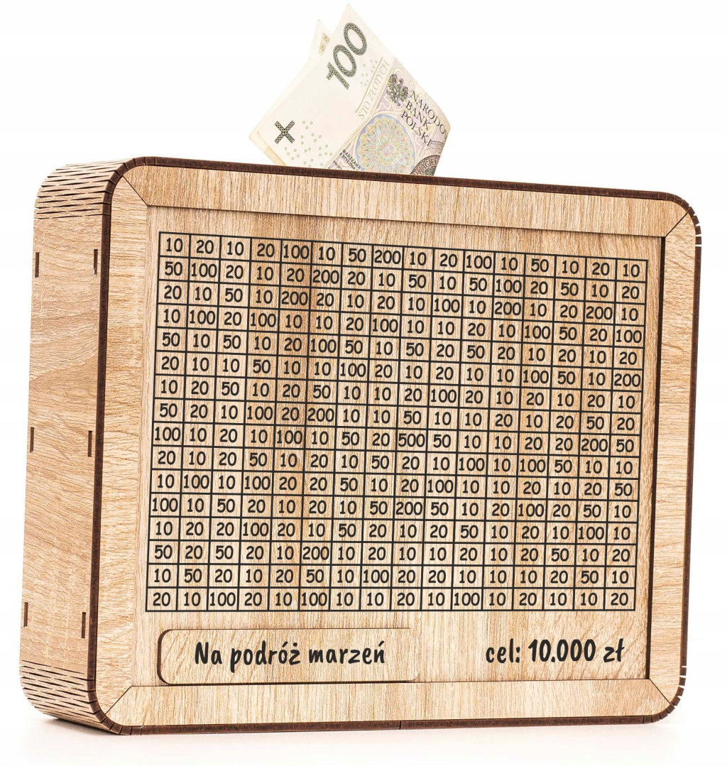 Oszczędzanie może być przyjemne i stylowe! Przedstawiamy Skarbonkę Drewnianą Wykreślaną cel: 10.000 zł, która nie tylko pomoże Ci zgromadzić oszczędności, ale również stanie się wyjątkowym elementem dekoracyjnym Twojego domu.