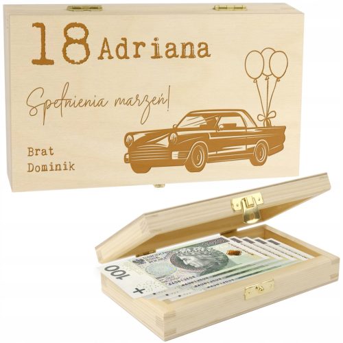 Personalizowane pudełko spełnia dwie funkcje. Jest stylowym etui na banknoty, a wygrawerowane na nim życzenia zastępują typową kartkę. Takie rozwiązanie jest świetnym pomysłem na urozmaicenie prezentu jakim są pieniądze.