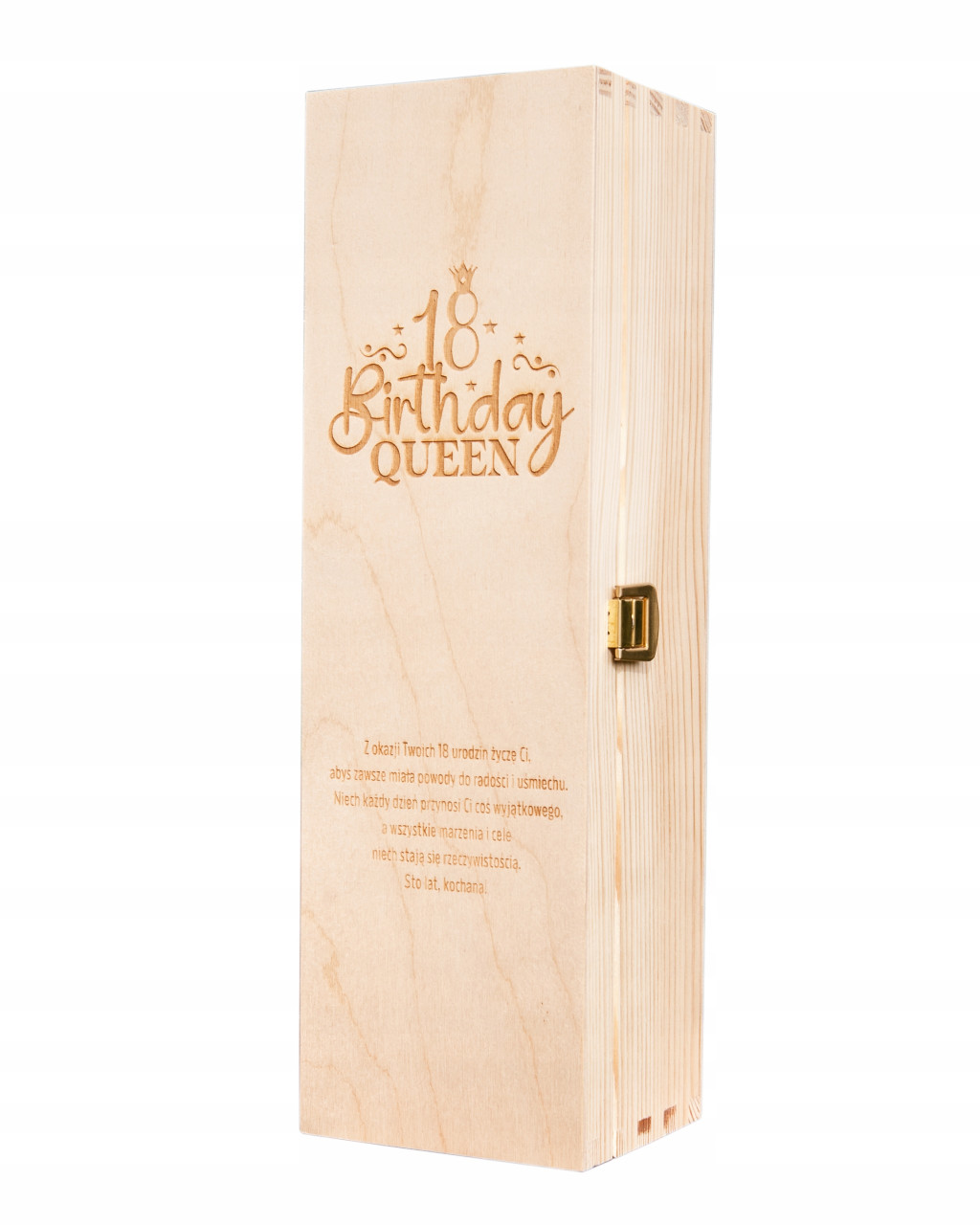 Skrzynka zamykana na alkohol w której możesz umieścić wino. Jest to elegancki prezent dla solenizanta z okazji 18-styki.. Produkt wykonany jest dokładnie i solidnie z drewnianej sklejki, oraz grawerowany według Twoich wytycznych.