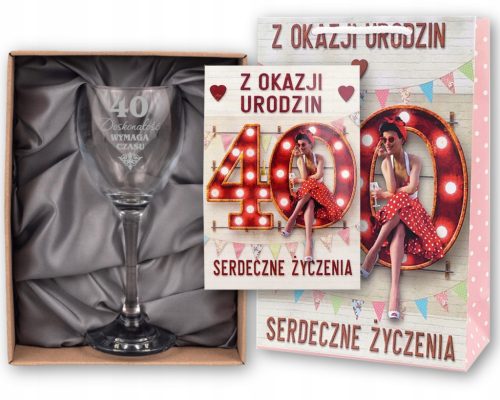 Elegancki szklany kieliszek udekorowany napisem "40 Doskonałość wymaga czasu". Delikatne grawerowane zdobienia dodające uroku. Zapakowany w prezentowe pudełko wypełnione satyną, gotowe do wręczenia jako prezent!