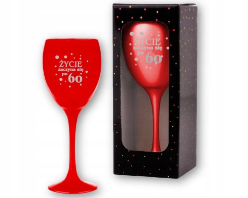 Elegancki szklany kieliszek do wina z grawerem " Życie zaczyna się po 60". Idealnie sprawdzi się jako prezent z okazji 60 urodzin! Zapakowany w dopasowane pudełko prezentowe.