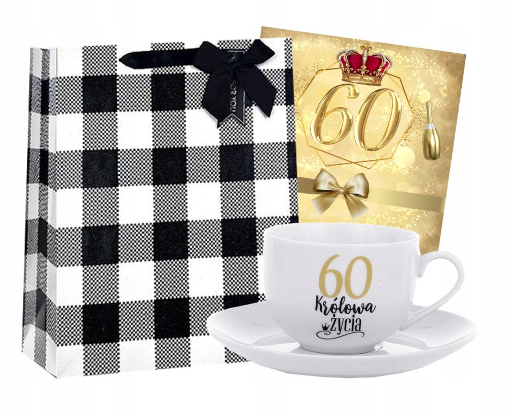 Wyjątkowa biała filiżanka z nadrukiem z okazji 60 urodzin: "Królowa życia!" w kolorystyce złoto-czarnej. Całość zapakowana w dopasowane stylistycznie kartonowe pudełko.