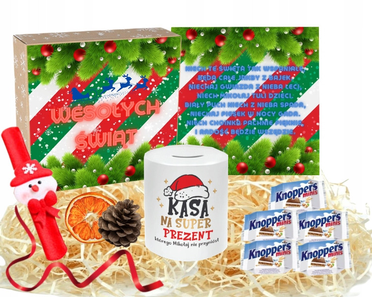 Ceramiczna skarbonka w kształcie walca z napisem 'KASA NA SUPER PREZENT, którego Mikołaj nie przyniósł'. Skarbonka posiada otwór umożliwiający wyjęcie pieniędzy. Skarbonka spakowana w ozdobne opakowanie, idealne do wręczenia na prezent na Mikołajki lub Święta!