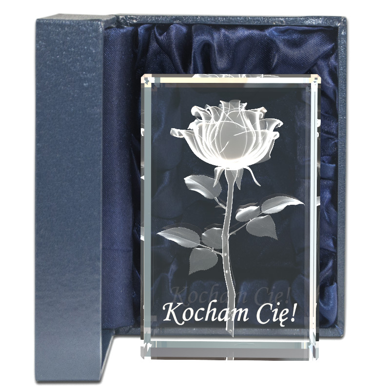 Piękna róża 3D wygrawerowana wewnątrz szklanej statuetki wraz z dedykacją "Kocham Cię"