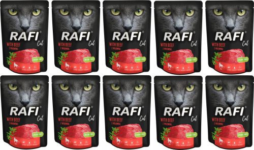 Pełnoporcjowa karma mokra Rafi Cat z wołowiną to posiłek, który wspiera utrzymanie optymalnej masy ciała oraz dobre samopoczucie Twojego pupila. Stanowiące aż 65% składu mięso wołowe i produkty pochodzenia zwierzęcego, są naturalnym źródłem mikro i makroelementów oraz witamin A,E i D3, które utrzymują dobrą kondycję skóry i sierści, wspomagają odporność, a także pozytywnie wpływają na stan zębów i kości. Dodane do receptury oleje lniany i z łososia są źródłem kwasów n-3 i n-6. Optymalny poziom witamin i minerałów, a także zawartych w karmie składników o charakterze prebiotycznym, sprawia, że jej regularne spożywanie przyczynia się do poprawy działania przewodu pokarmowego, perystaltyki jelit i odporności.