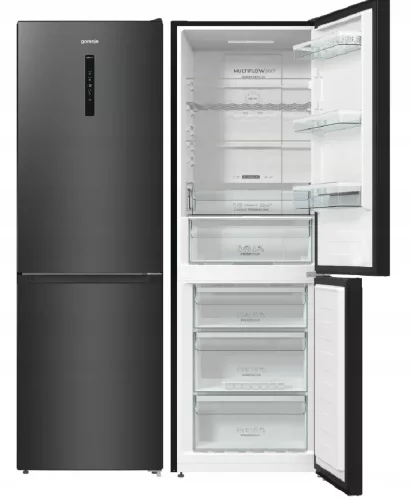 Wolnostojąca lodówka marki Gorenje, o klasie energetycznej: E, funkcją AdaptTech cooling - Inteligentnym systemem adaptacji i optymalizacji pracy. Chłodziarka w kolorze czarnym, szerokości 600 mm i wysokości 1850 mm