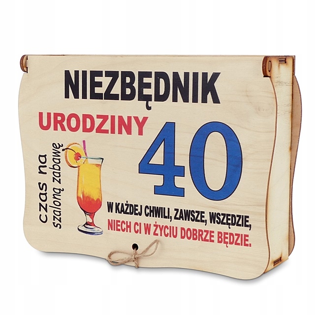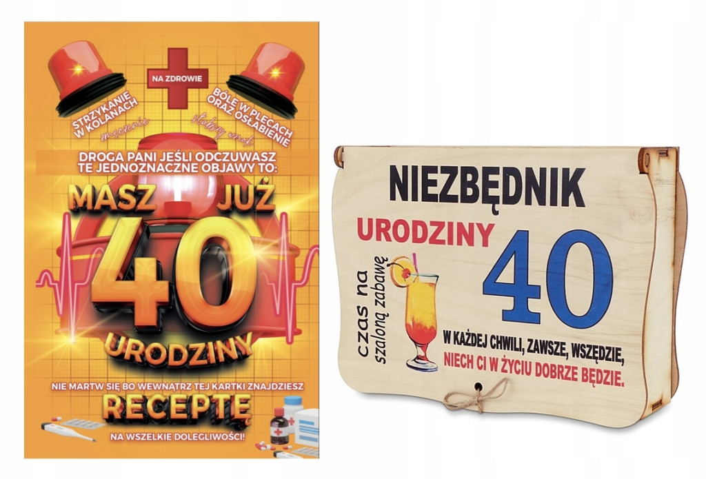 Wewnątrz karnetu znajduje się dedykowana recepta wzorowana na oryginalnym druku, którą wypełniają goście. Oryginalne i wesołe teksty zaskoczą każdego jubilata i z pewnością wywołają uśmiech na jego twarzy. Karnet może być idealnym dodatkiem do każdego prezentu. Karnet zawiera również humorystyczne życzenia.