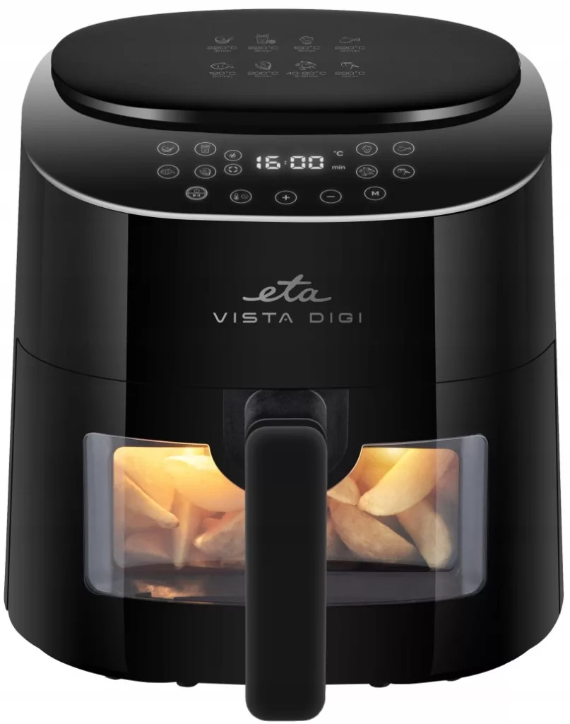 Frytkownica na gorące powietrze ETA Vista Digi znajdzie swoje miejsce w każdej kuchni. 8 programów zapewnia wielofunkcyjność urządzenia, za pomocą którego przygotujesz idealny stek, chrupiące frytki, soczystą rybę czy puszyste ciasto.