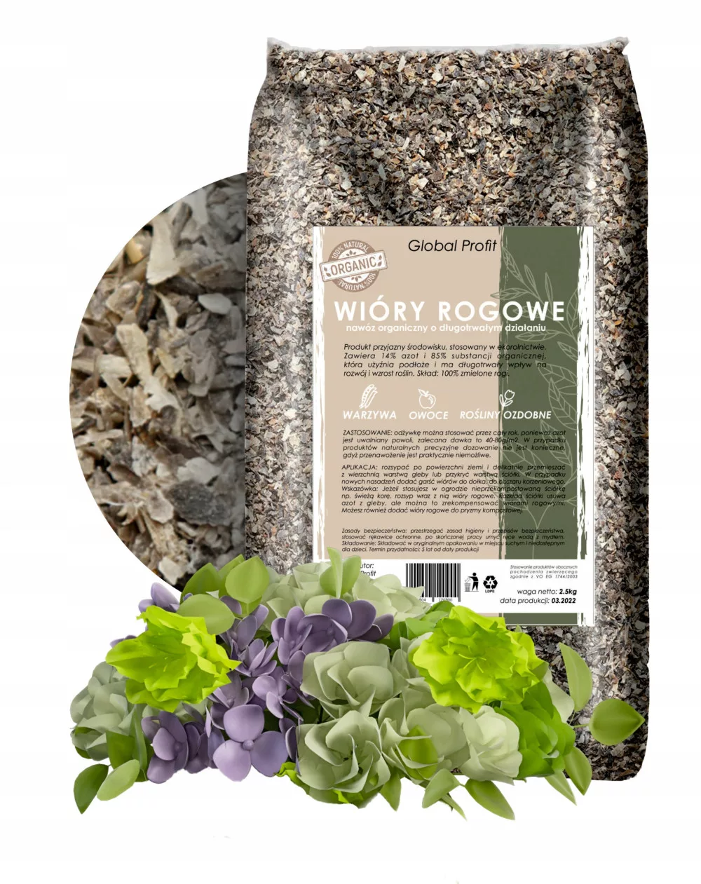 Zawiera 14% azot i 85% substancji organicznej, która użyźnia podłoże i ma długotrwały wpływ na rozwój i wzrost roślin.