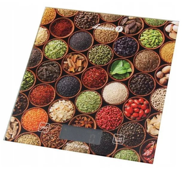 Elektroniczna waga kuchenna o maksymalnym załadunku 5000 g, z wyświetlaczem LCD, wskaźnikiem wyczerpania baterii, funkcją tary oraz z funkcją automatycznego wyłączania. Platforma ze szkła hartowanego z foto folią.